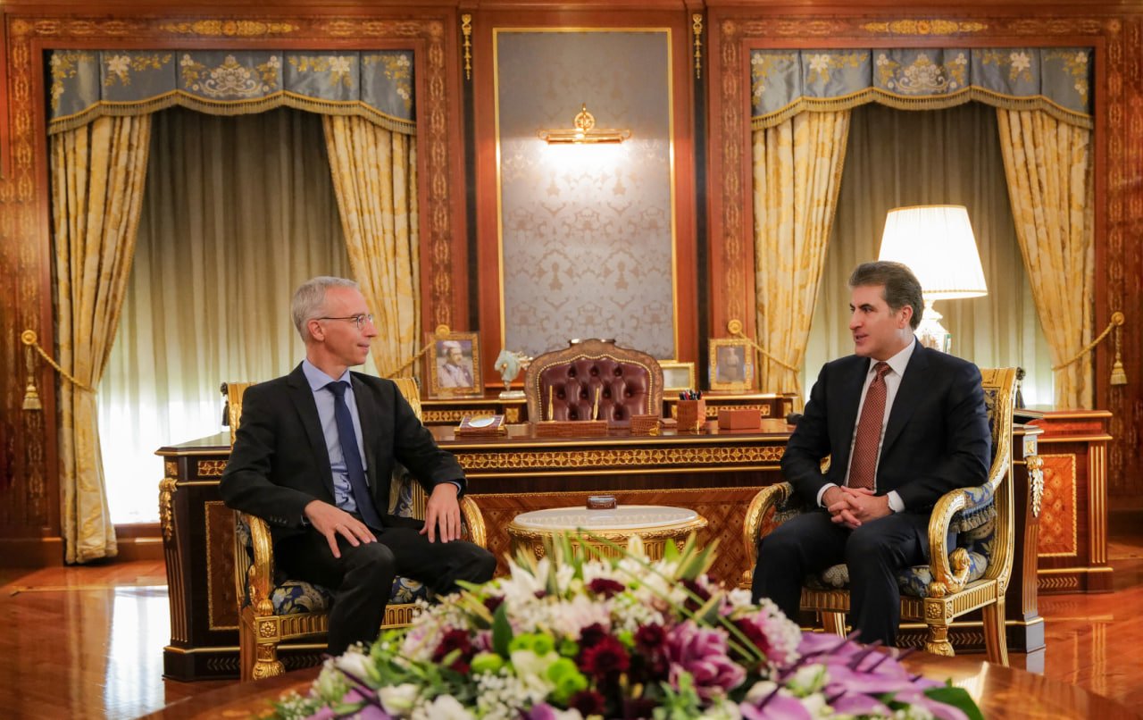 <h2>نێچیرڤان بارزانی، سەرۆكێ هەرێما كوردستانێ پێشوازی ل دانيێل كرێبهر، بالیۆزێ نوو یێ ئەلمانییا ل عیراقێ و شاندێ دگەلدا كر ، پیرۆزباهییا دەستبكاربوونا وی كر و هیڤییا سەركەڤتنێ بۆ خواست و هەموو پشتەڤانییا هەرێمێ بۆ سەرخستنا كارێ وی نیشاندا، هەروەسا سوپاسییا پشتەڤانی و هاریكارییێن ئەلمانییا بۆ عیراقێ و هەرێمێ كر.</h2> <h2>ژلایێ خۆڤە، بالیۆزێ ئەلمانییا سوپاسییا پێشوازی وپشتەڤانییا سەرۆكێ هەرێمێ كر، حەزا وەلاتێ خۆ بۆ زێدەتر پێشڤەبرنا پەیوەندییان و بەرفرەهكرنا هاریكارییا هەڤپشك دگەل عیراقێ و هەرێمێ ب تایبەت د بیاڤێ ئابووریدا دووپاتكر.</h2>
