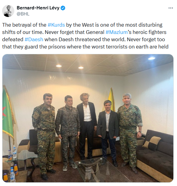 <h2>بێرنارد هێنری لیڤی، فەیلەسووف و نڤیسەرێ دیارێ فرەنسا ل سەر ئەكاونتێ خۆ یێ ئێكس، وێنەیەكێ خۆ دگەل مەزلووم عەبدی، فەرماندەیێ گشتییێ هێزێن سووریا دیموكرات و چەند فەرماندەیێن دی بەلاڤكر، ب توندی ڕەخنە ل هەلویستێ وەلاتێن ڕۆژئاڤایی بەرامبەر كوردان گرتن و ب خیانەت ناڤكر.</h2> <h2>لیڤی نڤیسییە، خیانەتكرن ل كوردان ژلایێ ڕۆژئاڤایڤە ئێك ژ وان گوهۆرینێن نەئارم یێن ڤی سەردەمینە.</h2> <h2>گوت ژی: نابیت جیهان ڕۆلێ كوردان ل شەرێ دژی تیرۆرێ ژبیر بكەت، چ جاران ژبیرنەكەت كو شەرڤانێن قارەمانێن مەزلووم عەبدی، داعش ژناڤبر دەمێ بوویە گەف ل سەر جیهانێ، چ جاران ژبیر نەكەن زێرەڤانییا ئەوان زیندانان دكەن یێن خرابترین تیرۆرستێن ل سەر ئەردی تێدا هاتینە گرتن.</h2>